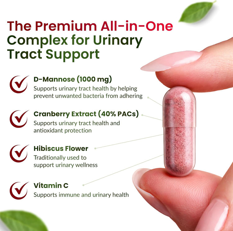 - SUPPORTS A HEALTHY URINARY TRACT - ForestLeaf D-Mannose Defense combines the herbal and flower extracts of cranberry and hibiscus along with Vitamin C into potent D-mannose 1000mg capsules and may provide relief to urinary tract symptoms such as pain, bloating, urge to pee, and excessive urination.